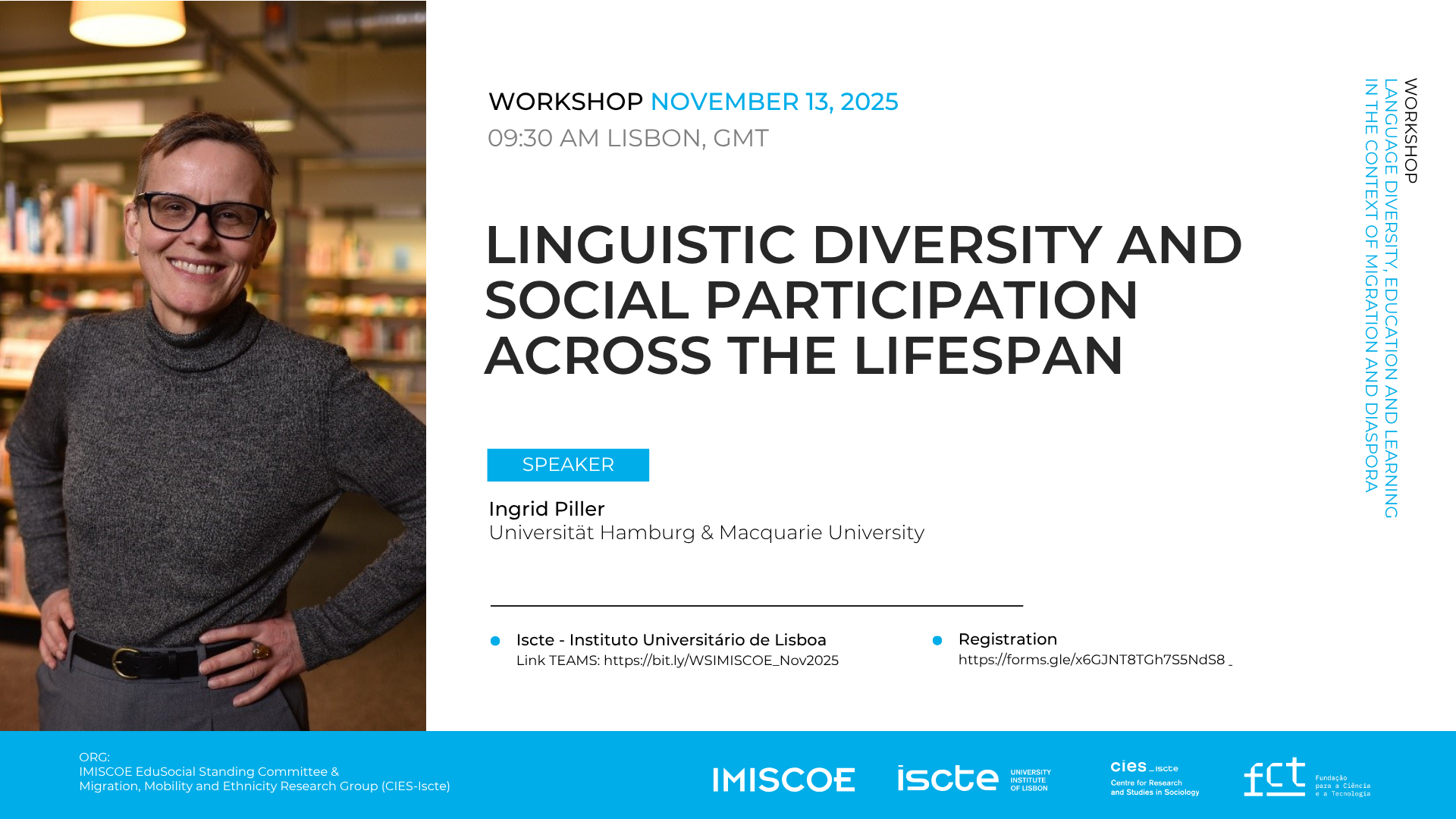 O CIES-Iscte, em parceria com o IMISCOE SC EduSocial, convida para participação online nas sessões de abertura e de encerramento do Workshop “Language Diversity, Education and Learning in the Context of Migration and Diaspora”, nos próximos dias 13 e 14 de novembro 2025, a partir do Iscte - Instituto Univeristário de Lisboa.