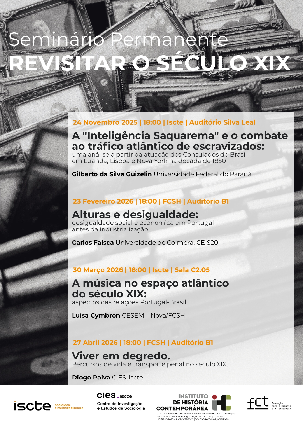 O seminário “Revisitar o Século XIX”, organizado por Gonçalo Rocha Gonçalves e Paulo Jorge Fernandes, resulta de uma colaboração entre o CIES-Iscte e o IHC – Instituto de História Contemporânea, da Universidade Nova de Lisboa.