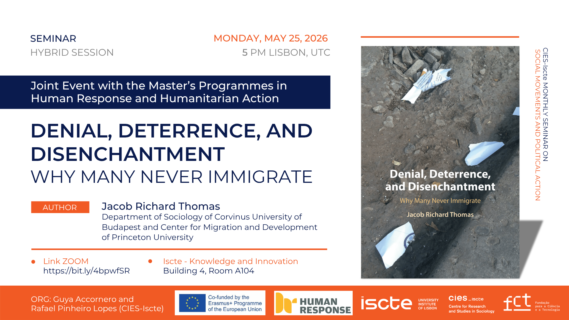 Integrado no Ciclo Mensal de Seminários de Movimentos Sociais e Ação Política, o próximo seminário com o título "Denial, Deterrence, and Disenchantment: Why Many Never Immigrate", decorre no dia 25 de maio de 2026, pelas 17h00, em formato híbrido.