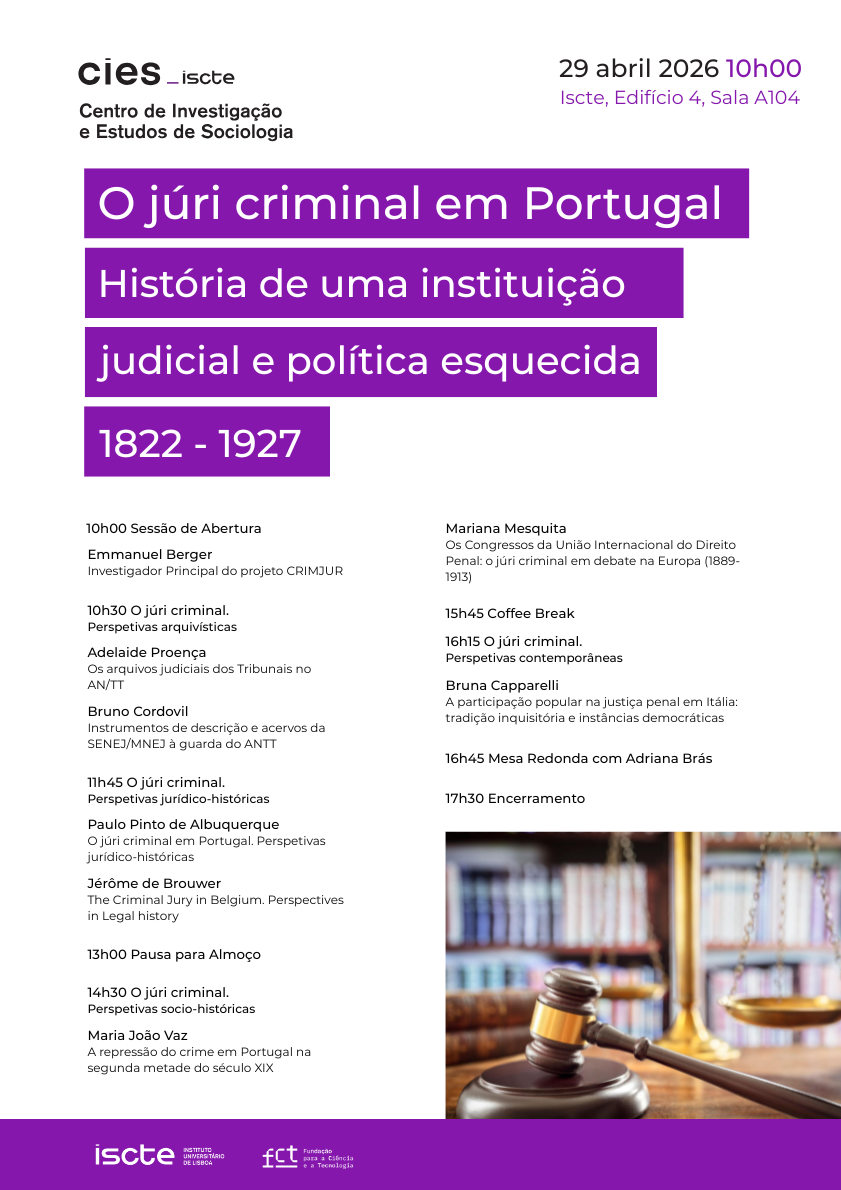 No dia 29 de abril 2026, o CIES fará a apresentação pública do projeto CRIMJUR – O júri criminal em Portugal. História de uma instituição judicial e política esquecida (1822–1927), liderado pelo investigador Emmanuel Berger.