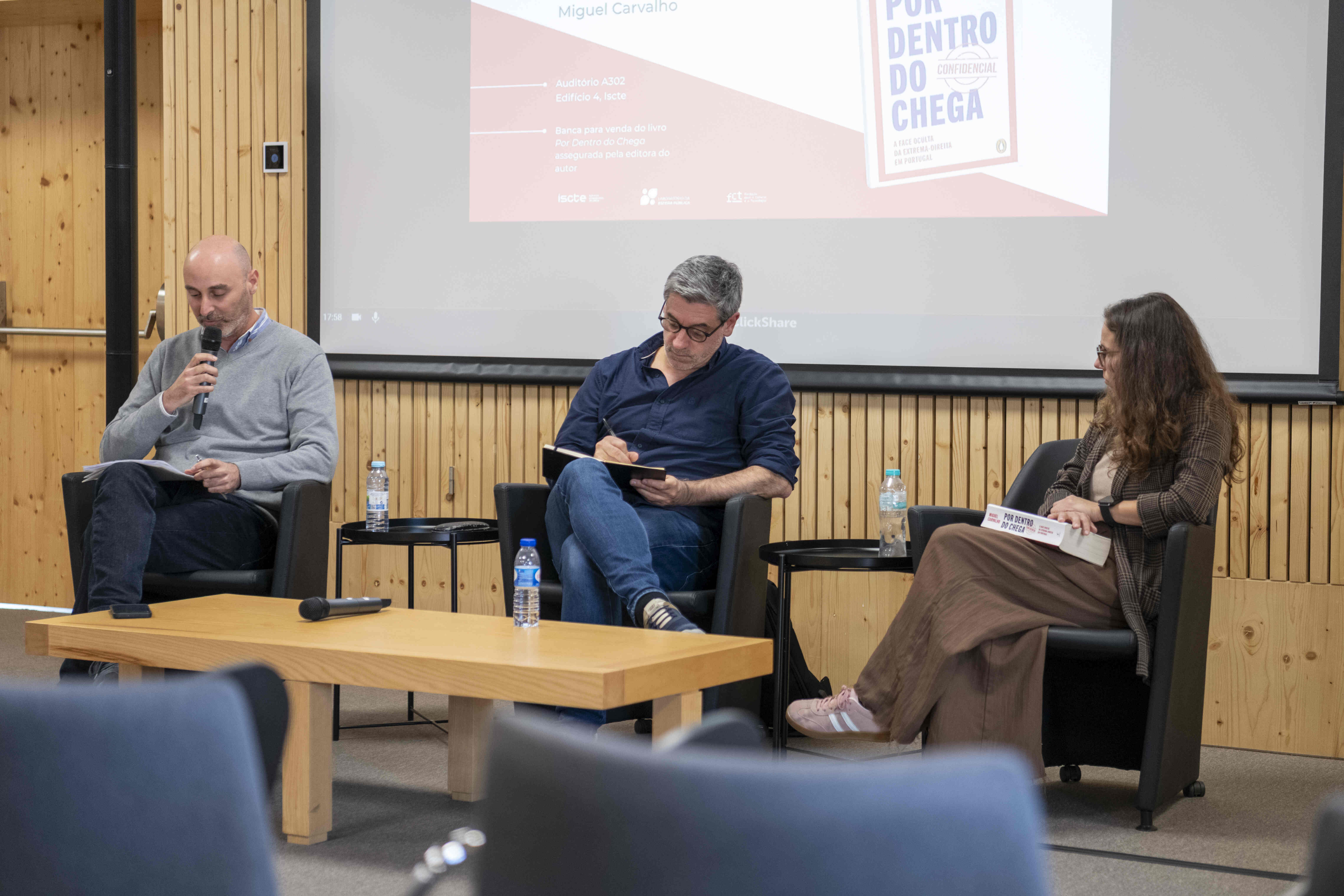 O ponto de partida foi o livro Por Dentro do Chega, do jornalista Miguel Carvalho, utilizado como caso de estudo para discutir métodos e desafios da investigação jornalística. A sessão funcionou como um espaço de transferência de conhecimento, aproximando práticas do jornalismo de investigação de abordagens analíticas típicas das ciências sociais.