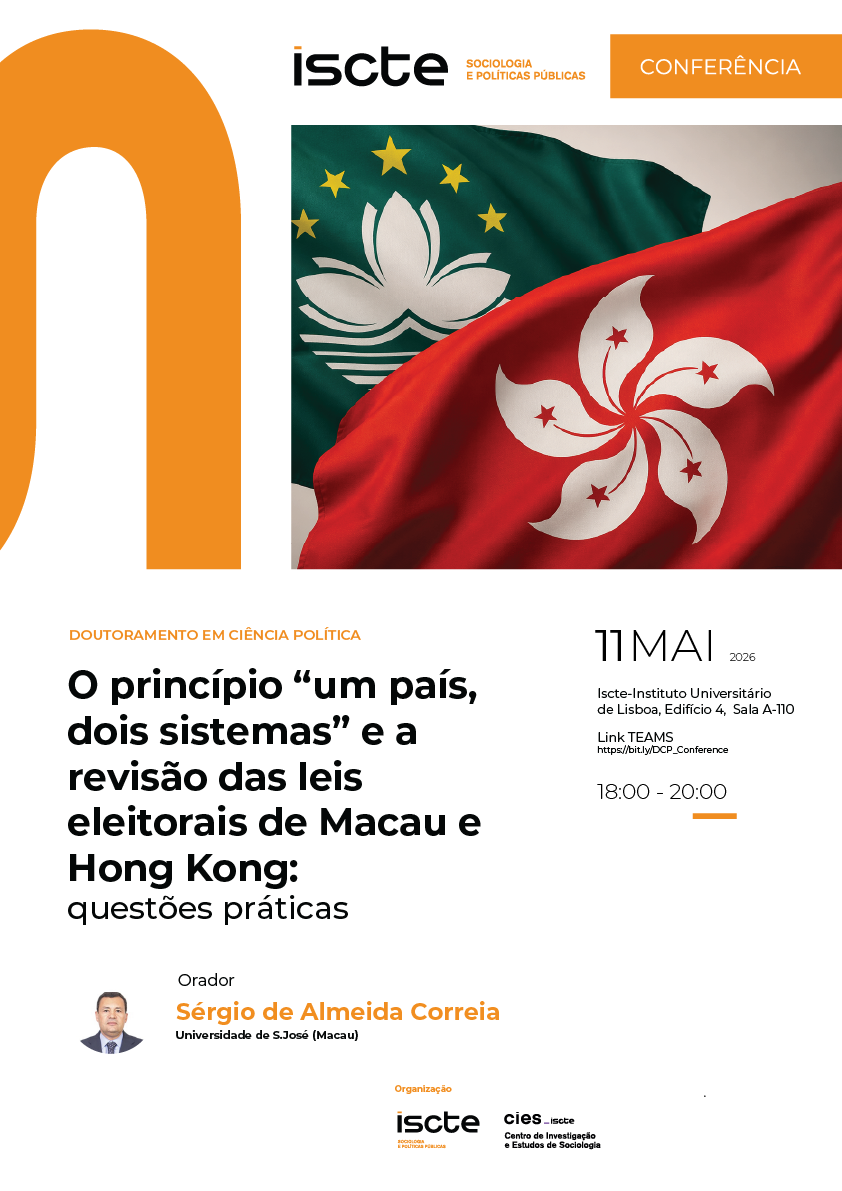 A conferência doutoral "O princípio “um país, dois sistemas” e a revisão das leis eleitorais de Macau e Hong Kong: questões práticas" terá como orador convidado Sérgio de Almeida Correia da Universidade de S.José (Macau) e decorre no próximo dia 21 de maio em formato híbrido.