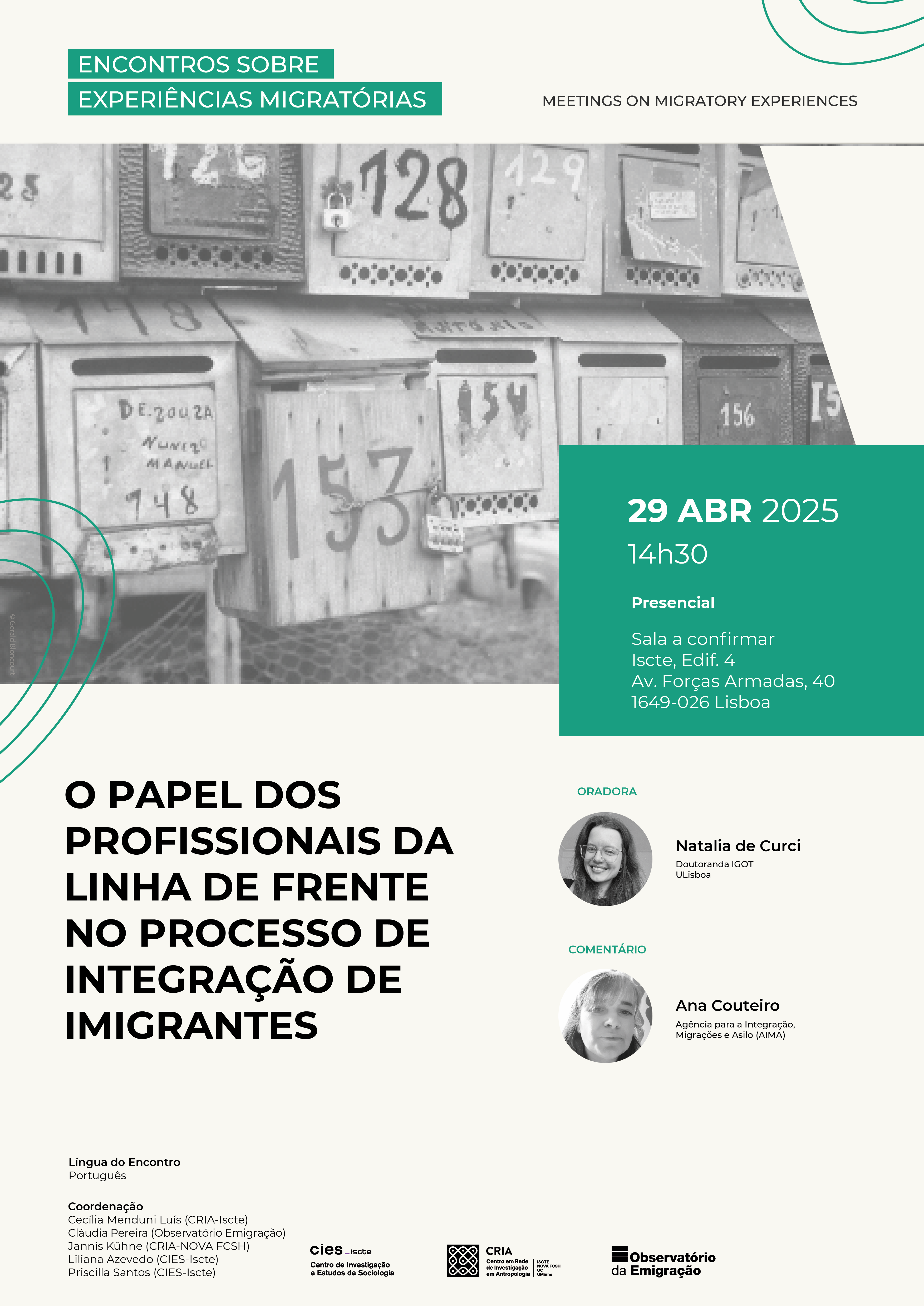 The next Meeting on Migration Experiences is scheduled for April 29, 2025, starting at 2:30 p.m. The focus will be on “The Role of Frontline Professionals in the Immigrant Integration Process.”