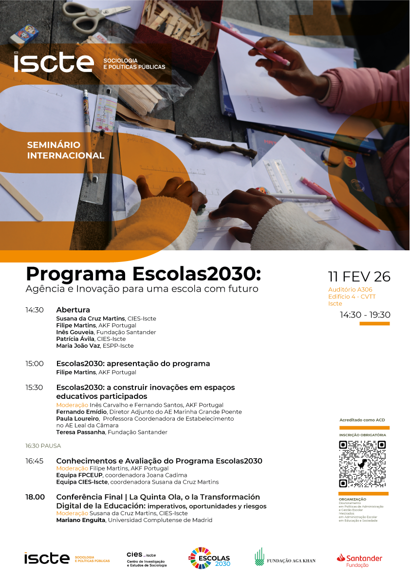 The International Seminar “Programa Escolas2030: Agência e Inovação para uma escola com futuro” will take place on February 11 at Iscte – University Institute of Lisbon.