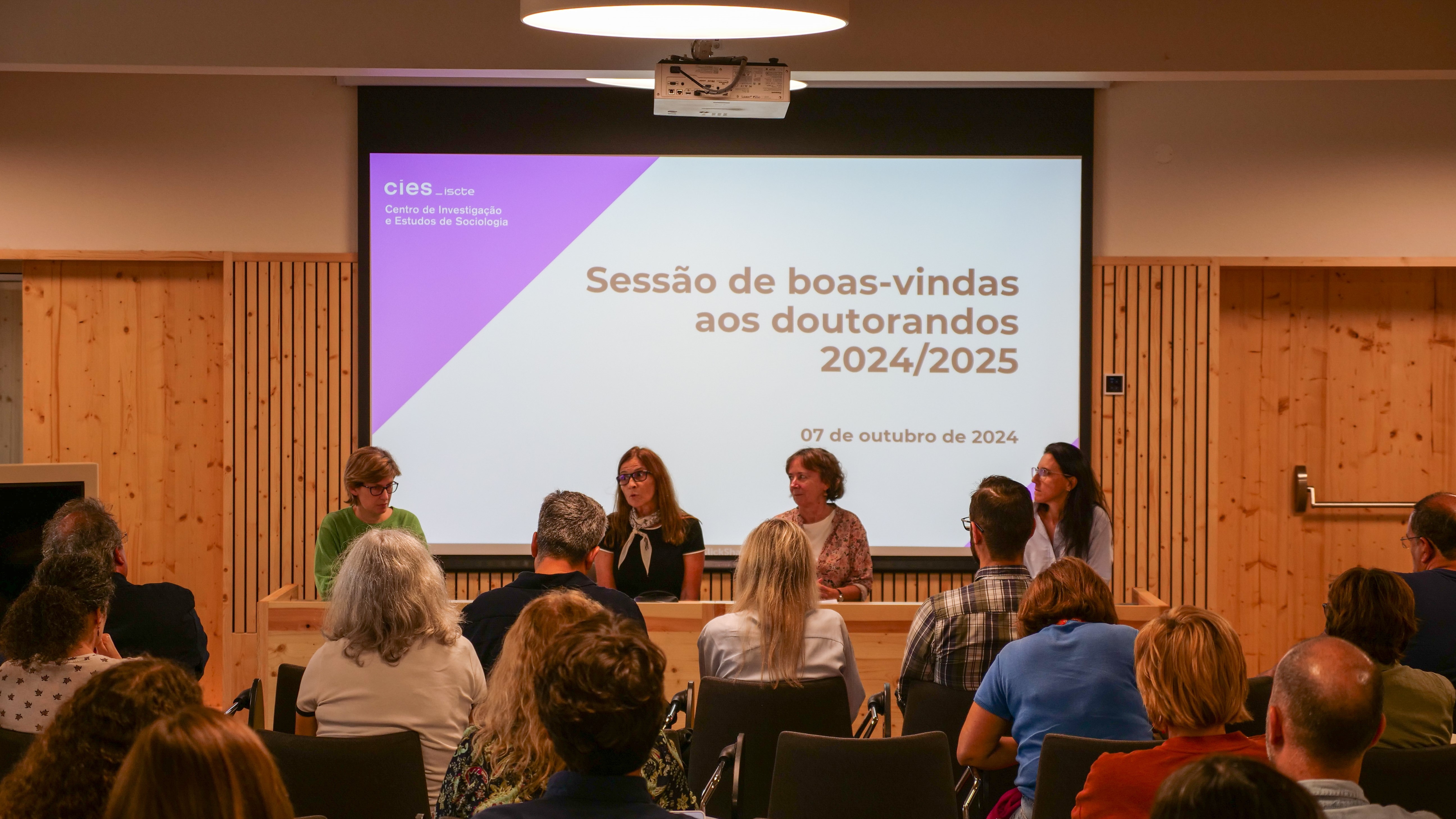 A sessão iniciou com uma intervenção da Diretora do CIES-Iscte, Teresa Patrício, que destacou o papel da investigação científica na construção de sociedades mais justas e inclusivas, reforçando o compromisso do CIES em apoiar o desenvolvimento académico dos novos estudantes de doutoramento.