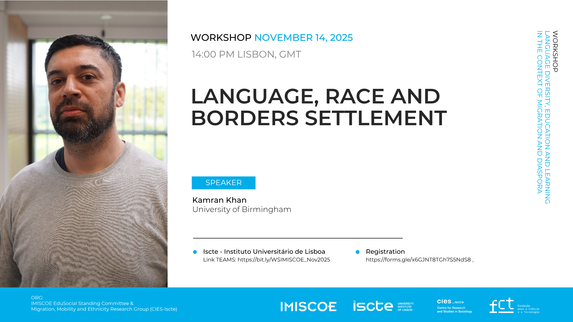 O CIES-Iscte, em parceria com o IMISCOE SC EduSocial, convida para participação online nas sessões de abertura e de encerramento do Workshop “Language Diversity, Education and Learning in the Context of Migration and Diaspora”, nos próximos dias 13 e 14 de novembro 2025, a partir do Iscte - Instituto Univeristário de Lisboa.