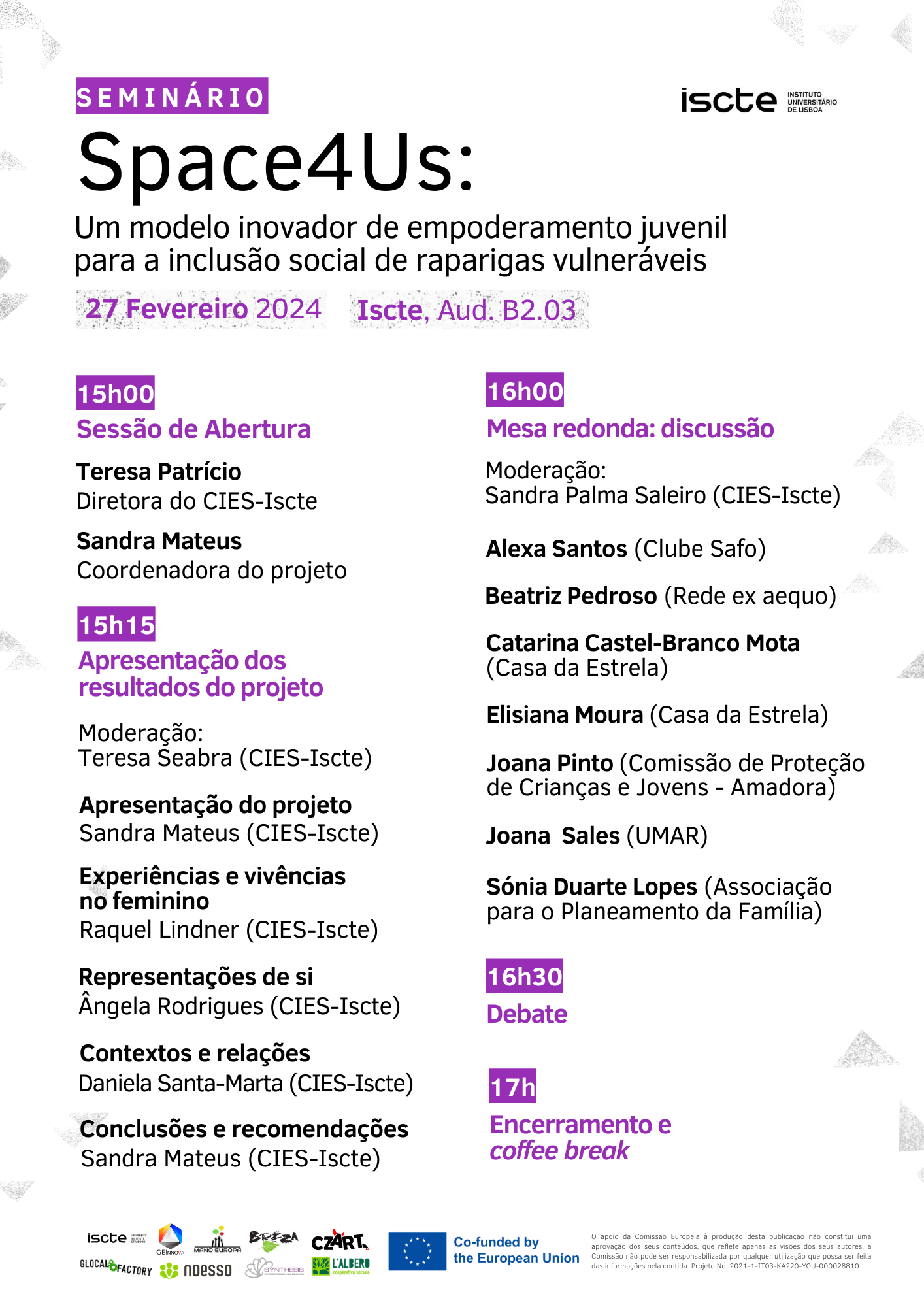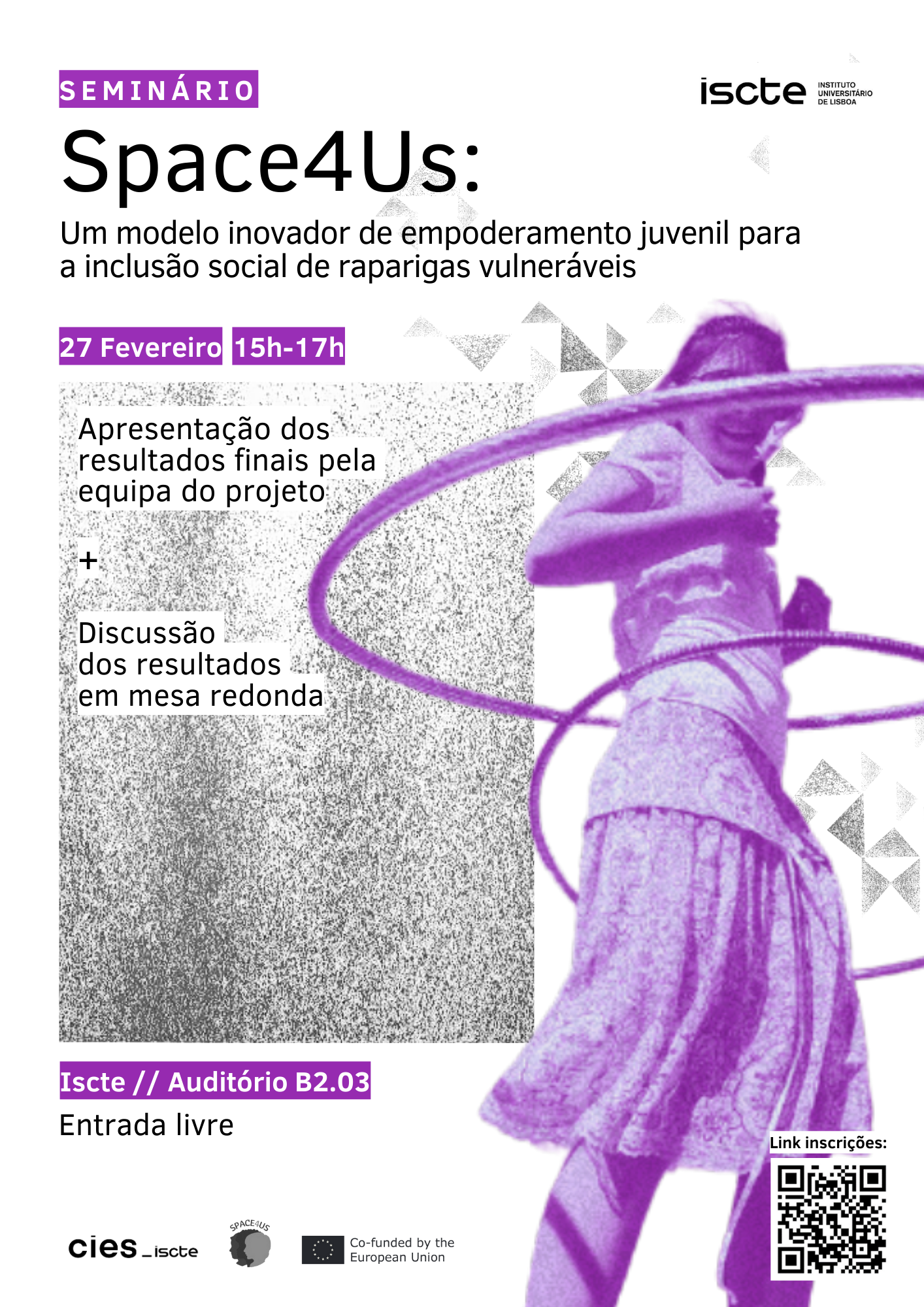 O seminário do Projeto de investigação Space4Us - Um modelo inovador de empoderamento coletivo juvenil para promover a inclusão social de adolescentes vulneráveis irá decorrer no Iscte, Auditório B2.03, no dia 27 fevereiro entre as 15h e as 17h.