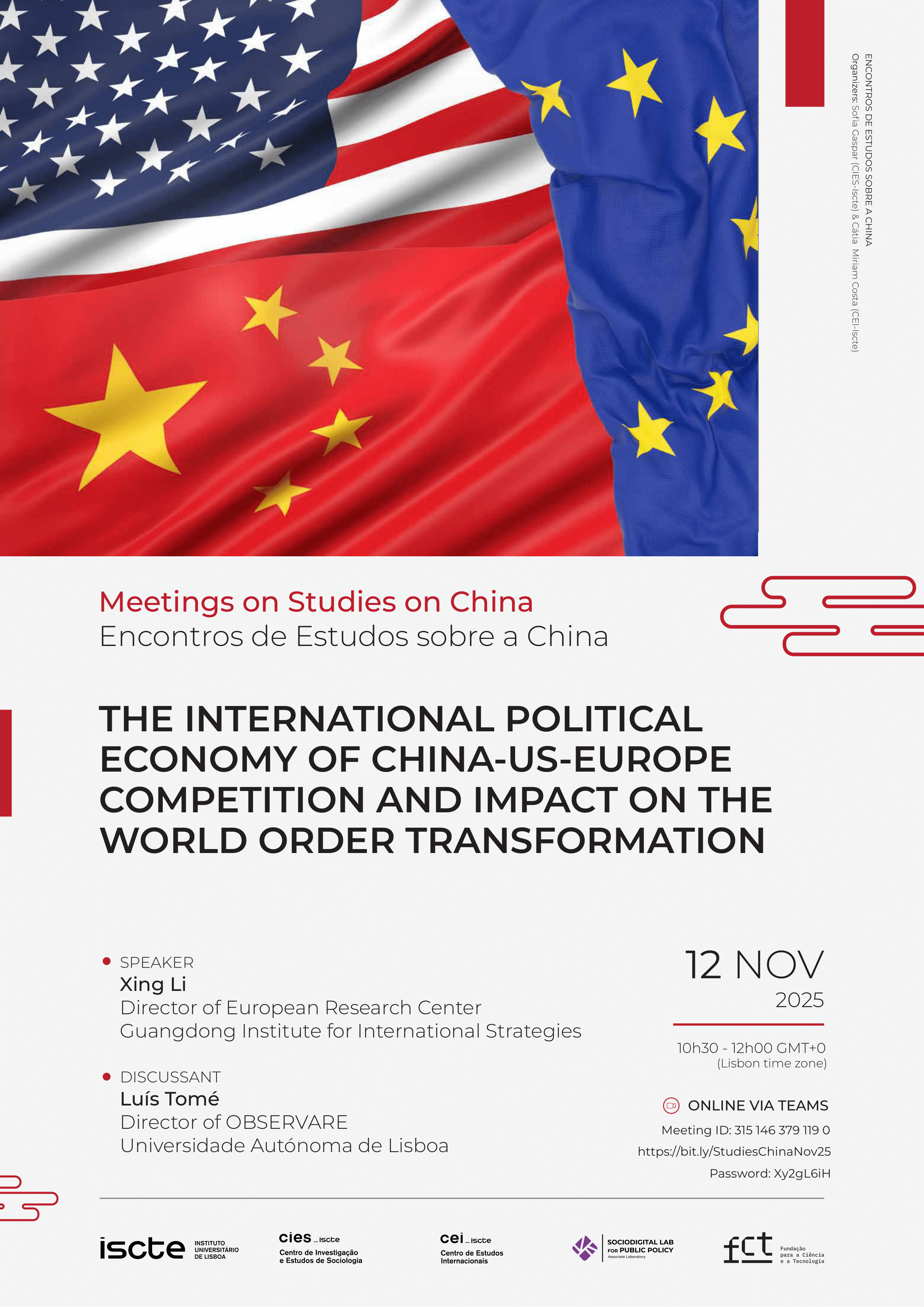 The guest speaker is Xing Li, Director of the European Research Center Guangdong Institute for International Strategies, and the commentary will be provided by Luís Tomé, Director of OBSERVARE Autonomous University of Lisbon.