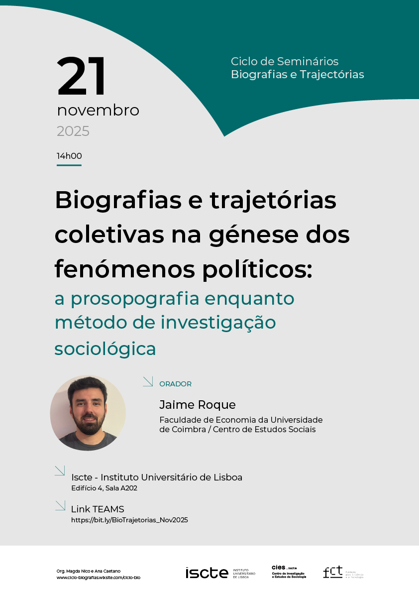The next seminar in the Biographies and Trajectories Cycle will take place on November 21, 2025, starting at 2 p.m., with the theme “Biographies and collective trajectories in the genesis of political phenomena: prosopography as a method of sociological research,” in a hybrid format.