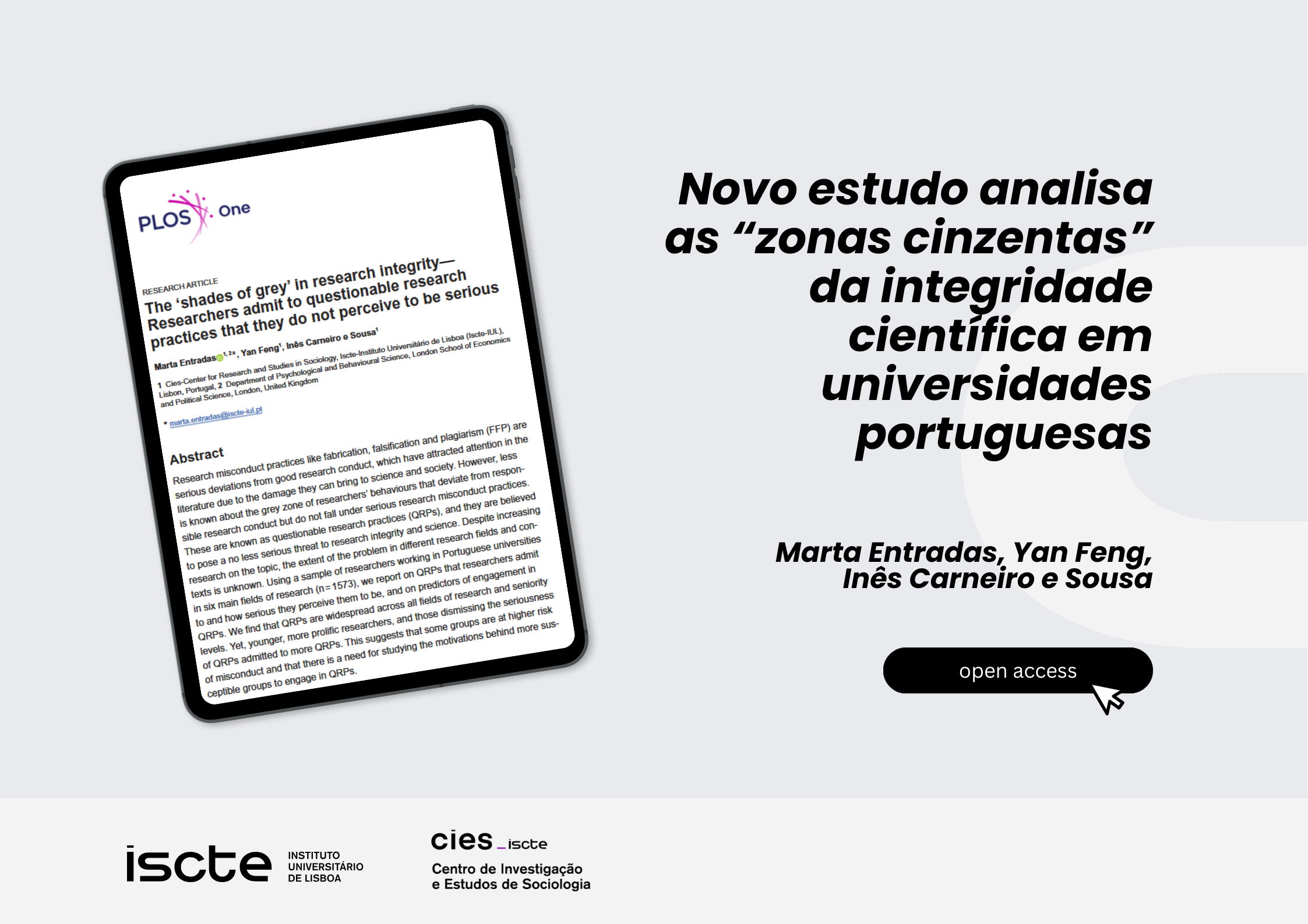 A new study published in PLOS One, authored by CIES researchers Marta Entradas (study coordinator), Yan Feng, and Inês Carneiro e Sousa, examines the “grey areas” of scientific integrity. The study reveals that questionable research practices are common in Portuguese universities and are often perceived as minor or normalized in everyday academic life.