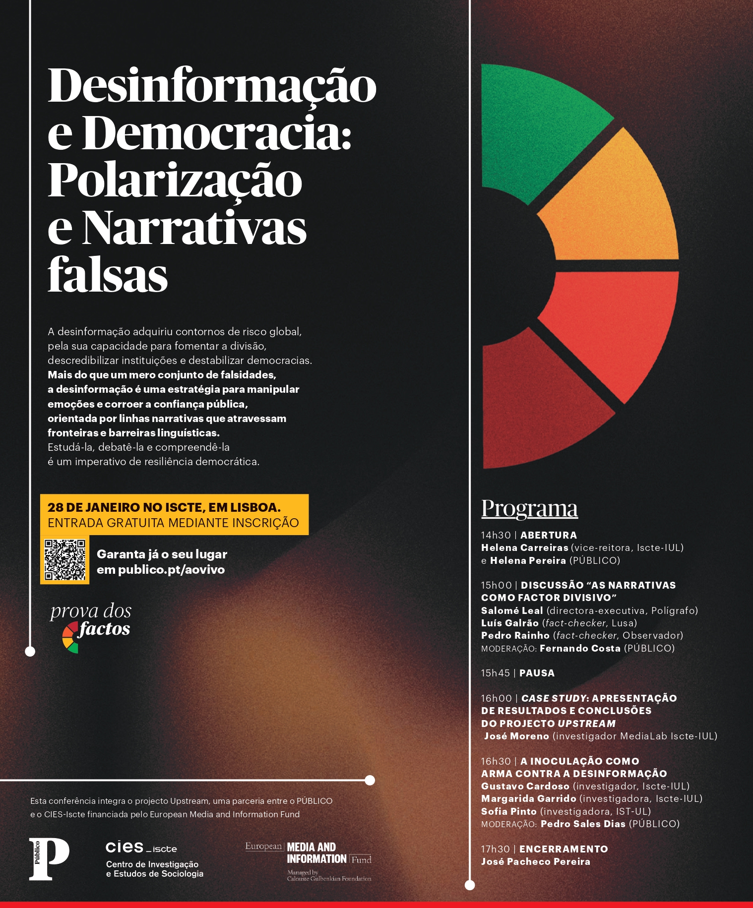 The PÚBLICO and the Centro de Investigação e Estudos de Sociologia (CIES-Iscte) are organizing the second edition of the Disinformation and Democracy conference, dedicated to the analysis of polarization and the dissemination of false narratives in the public sphere, to be held on 28 January 2026. Under the theme “Polarization and False Narratives”, the event will bring together researchers and experts to discuss the impacts of disinformation on contemporary democracy.